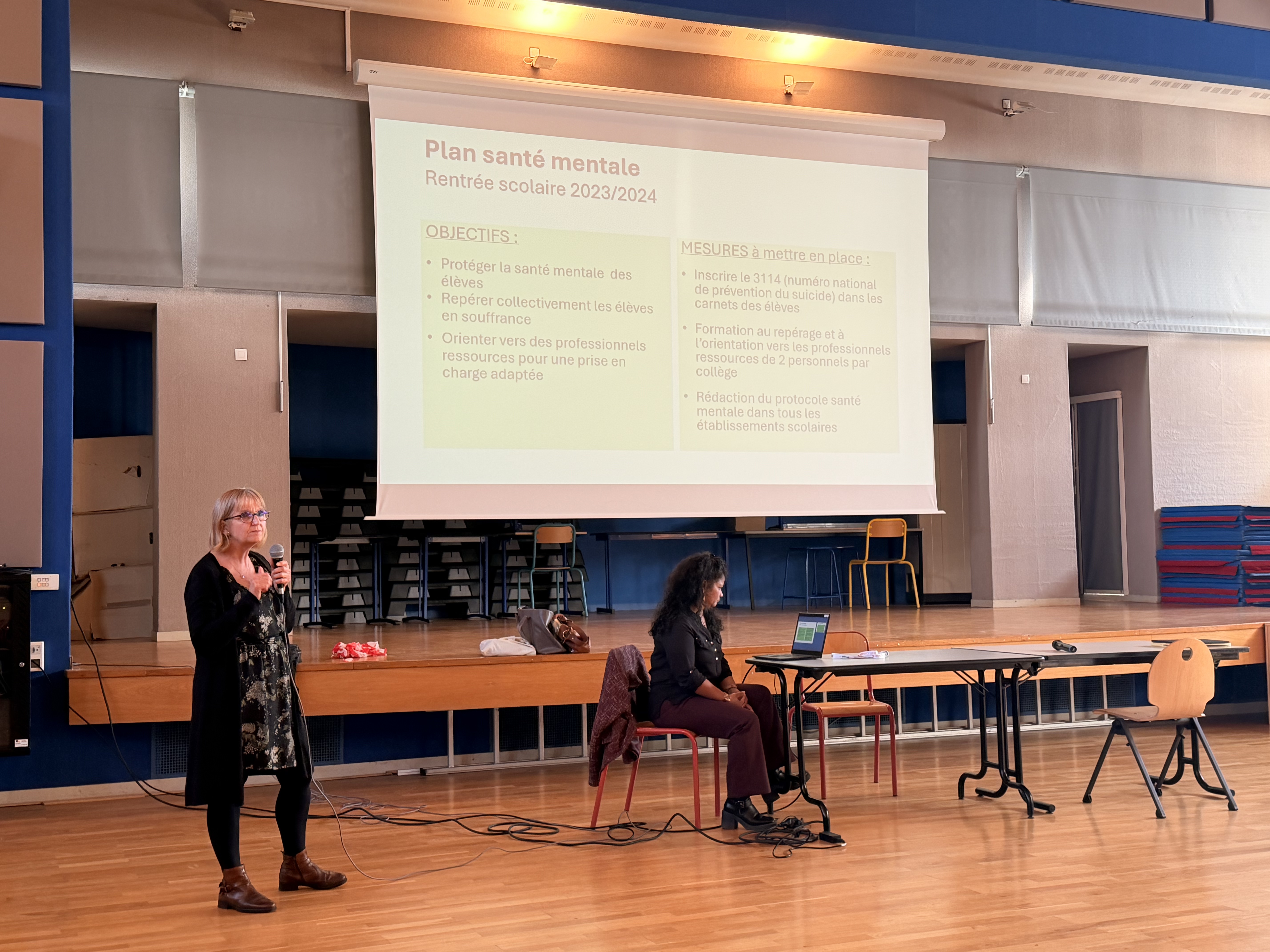 Présentée par Colette Chambard (Infirmière conseillère technique du Recteur - Cellule Santé Mentale académique), cette intervention a détaillé le plan académique santé mentale : inscription du 3114 dans les carnets, formation au repérage et à l’orientation de personnels ressources dans chaque établissement, rédaction de protocoles santé mentale et renforcement de l’offre de formation.