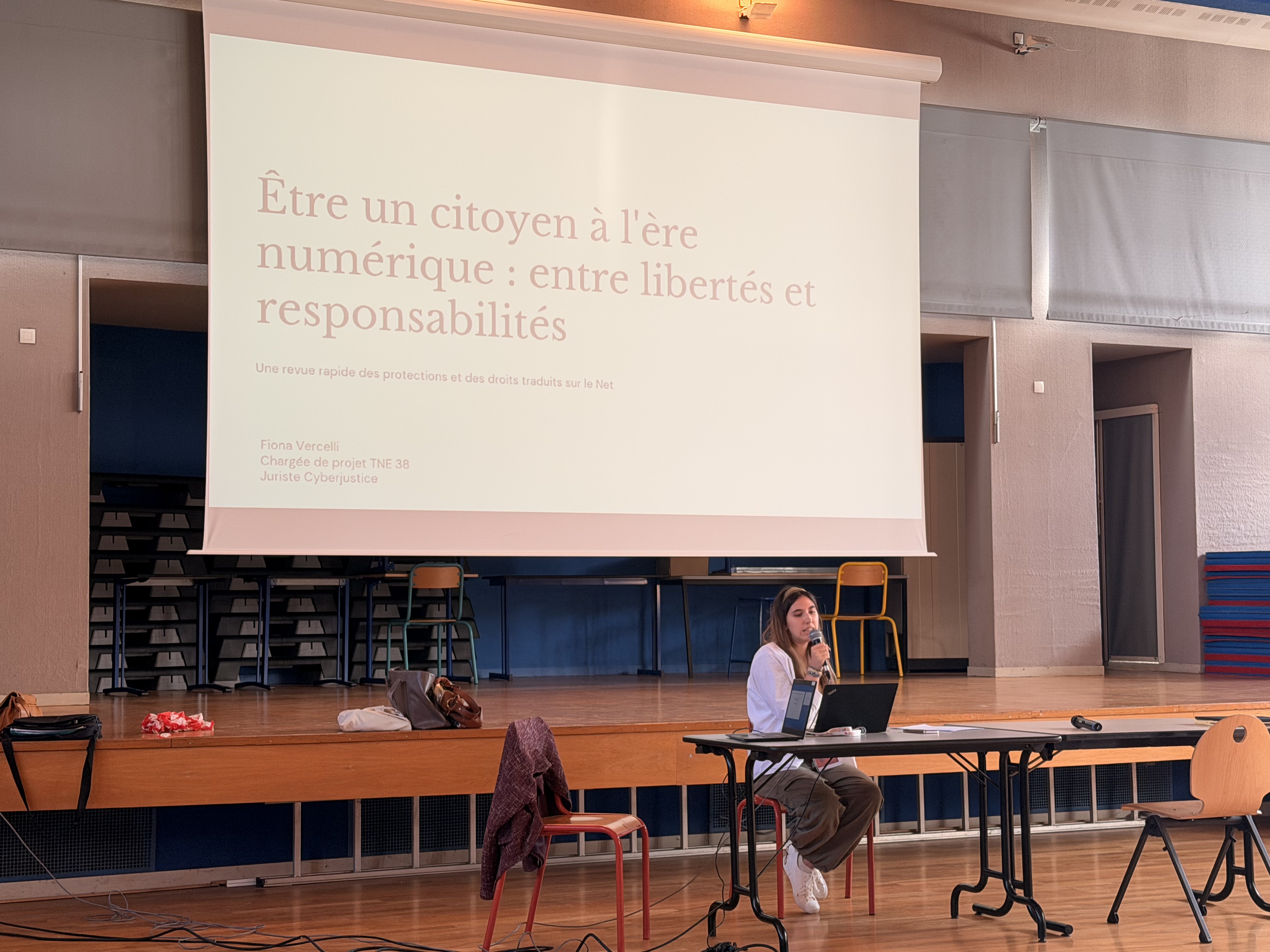 Tous les participants de la journée se sont regroupés pour débuter l'après-midi en plénière sur le thème « Être un citoyen à l’ère numérique : entre libertés et responsabilités ». L’intervention consacrée aux repères juridiques proposé par Fiona Vercelli (Chargée de mission TNE) a rappelé les principes essentiels : protection des données personnelles, droits d’accès, de rectification, d’opposition, d’oubli et de déréférencement, ainsi que les limites à la liberté d’expression en ligne.