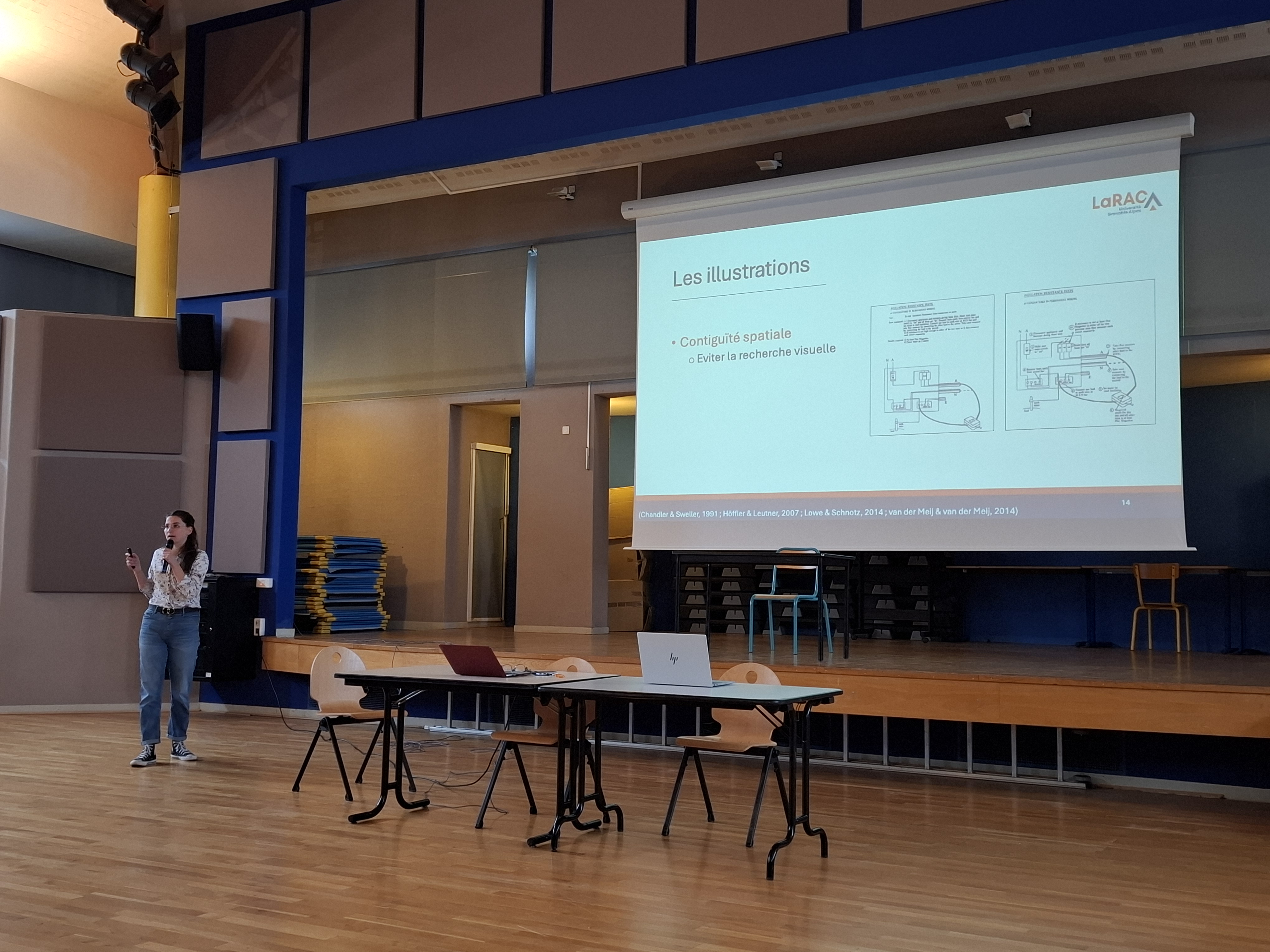 Léa Guilbert, doctorante au LaRAC (Laboratoire de Recherche Appliquée en Cognition et Apprentissages) est intervenue sur la mémoire de travail, la charge cognitive et les usages du numérique avec une focale sur les principes de contiguïté spatiale et de recherche visuelle dans les supports pédagogiques