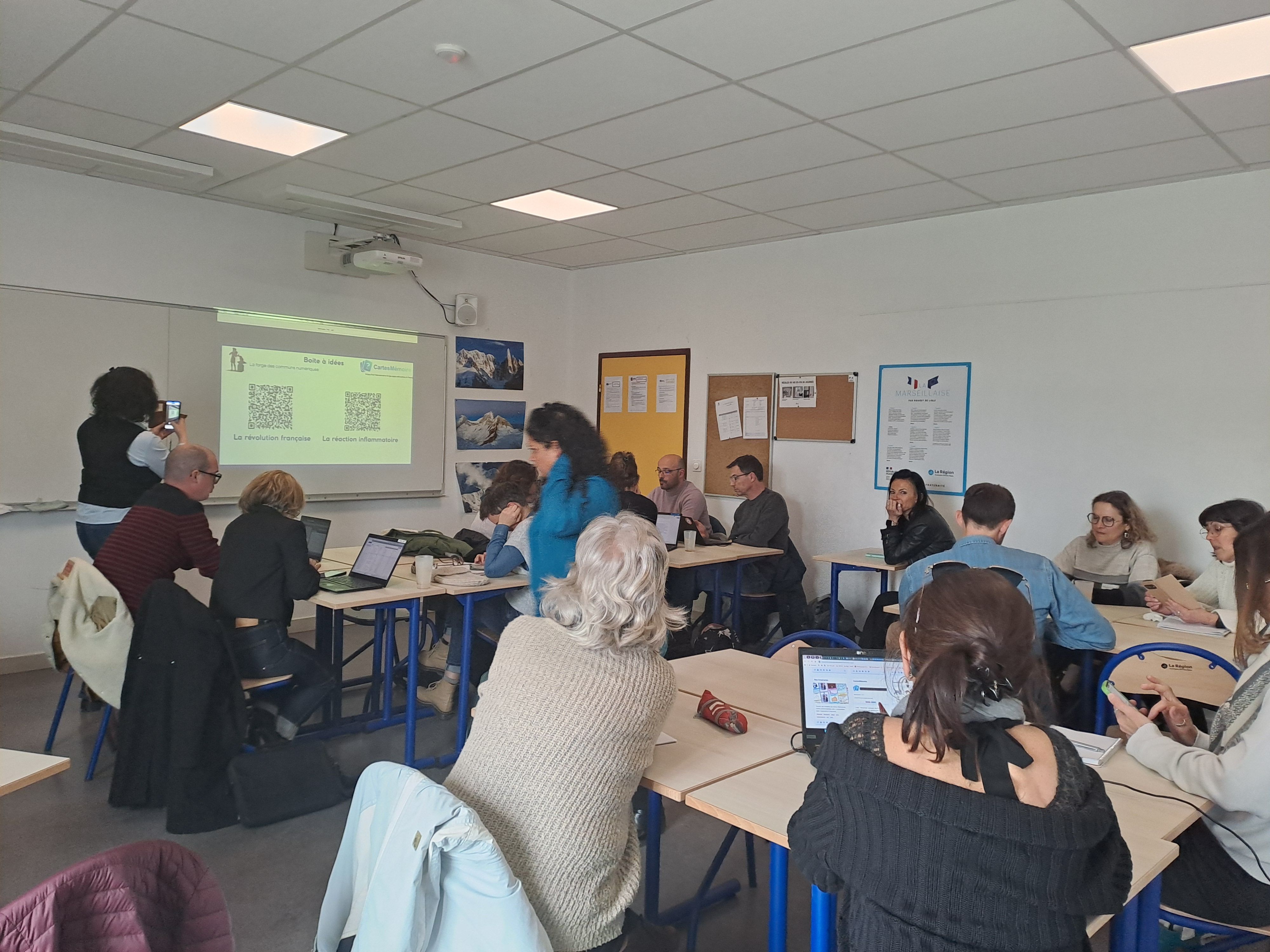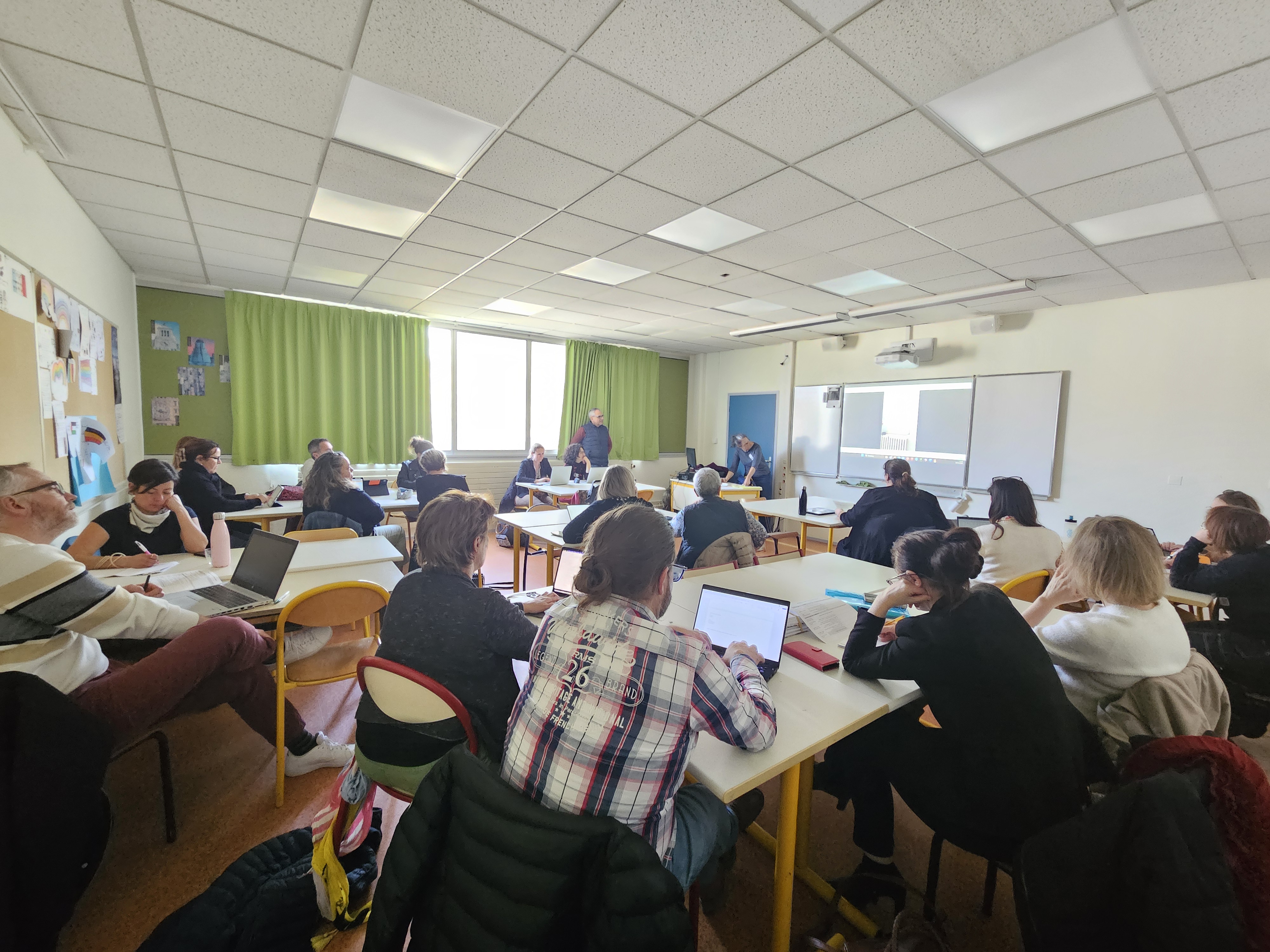 L'après-midi, les participants se sont répartis en deux ateliers tournants, avec un objectif commun : mettre en lien gestes professionnels, numérique et apprentissages. Ces ateliers, animés en binôme, ont permis de croiser les regards entre premier et second degrés et de produire des réflexions concrètes ancrées dans les pratiques de classe.