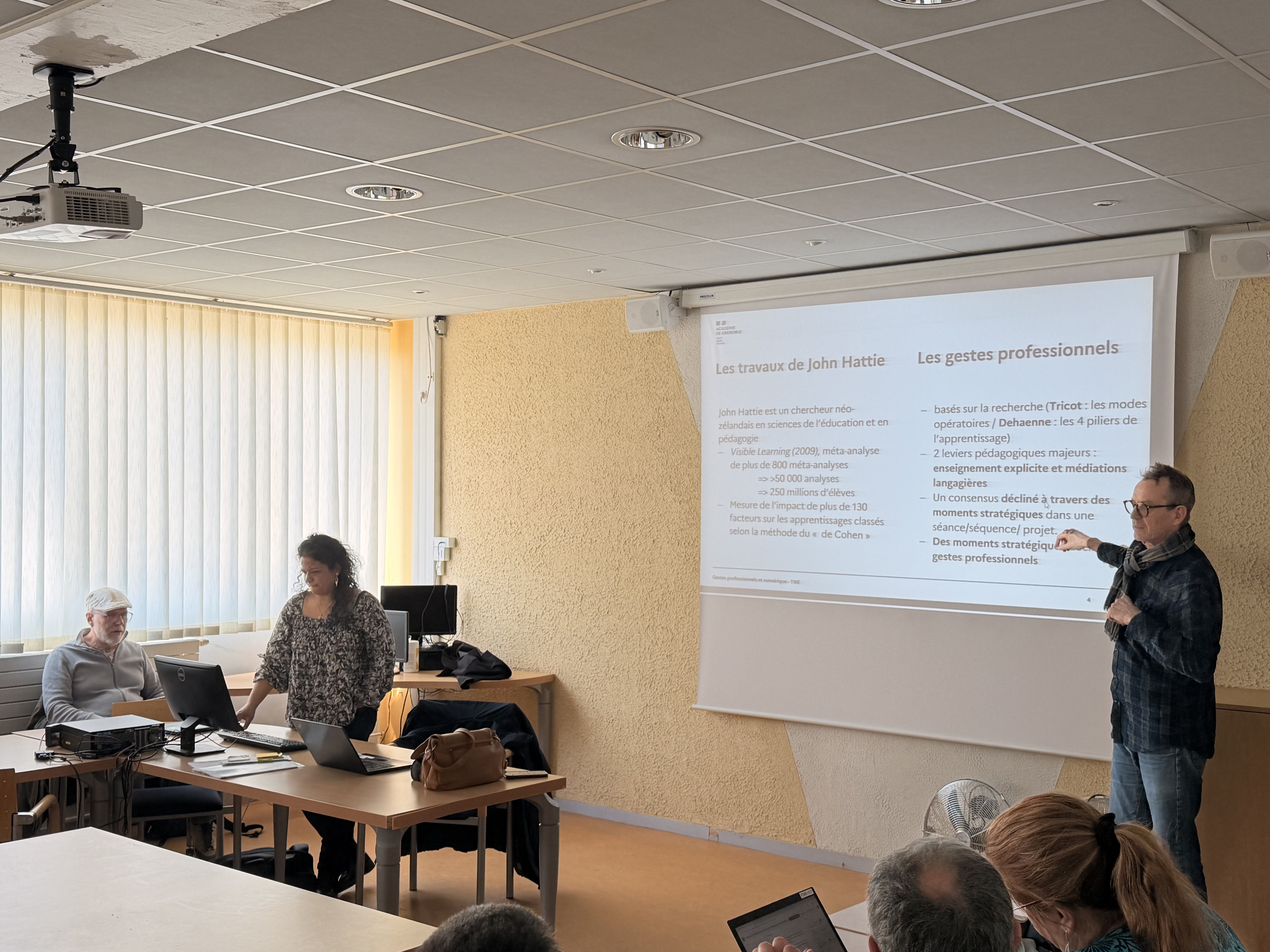La matinée s'est poursuivie avec des apports scientifiques de premier plan. Julien Douady et Christian Hoffmann, du groupe METAH (Modèles et Technologies pour l'Apprentissage Humain) du Laboratoire Informatique de Grenoble (UGA), ont présenté leurs travaux de recherche sur l'usage efficace du numérique dans les apprentissages.