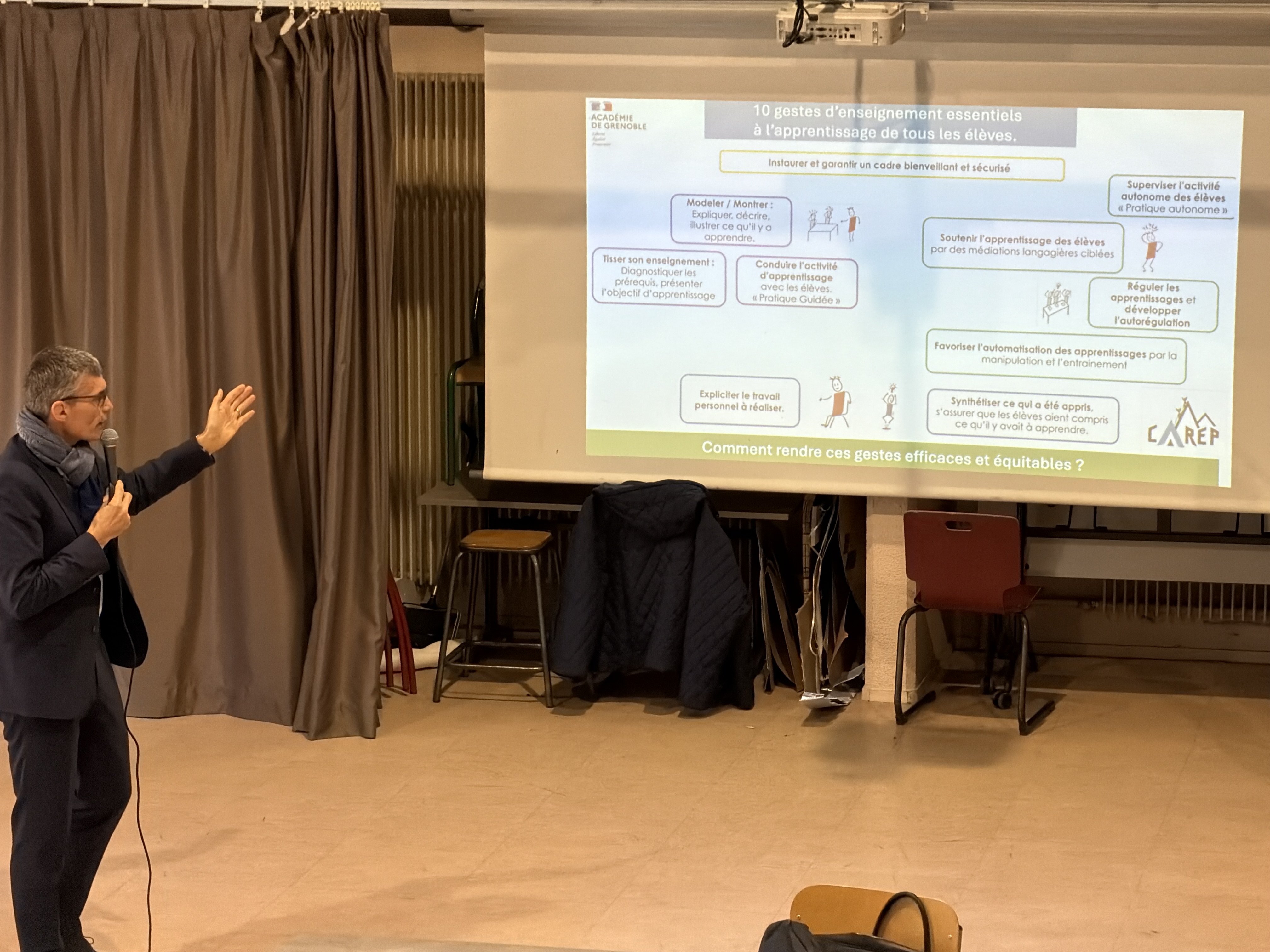 Ces gestes - modeler, expliquer, donner un enseignement explicite, susciter l'engagement, conduire un apprentissage coopératif, superviser l'activité, évaluer, réguler, favoriser l'automatisation, synthétiser - constituent le fil rouge de la journée et du dispositif CAP2E (Collectif Apprenant pour des Pratiques Efficaces et Équitables), déployé dans 20 collèges de l'académie.