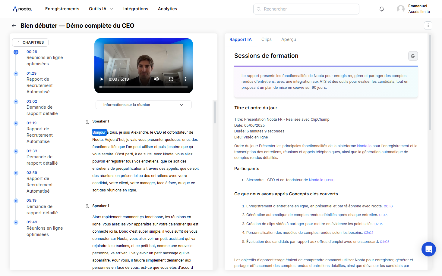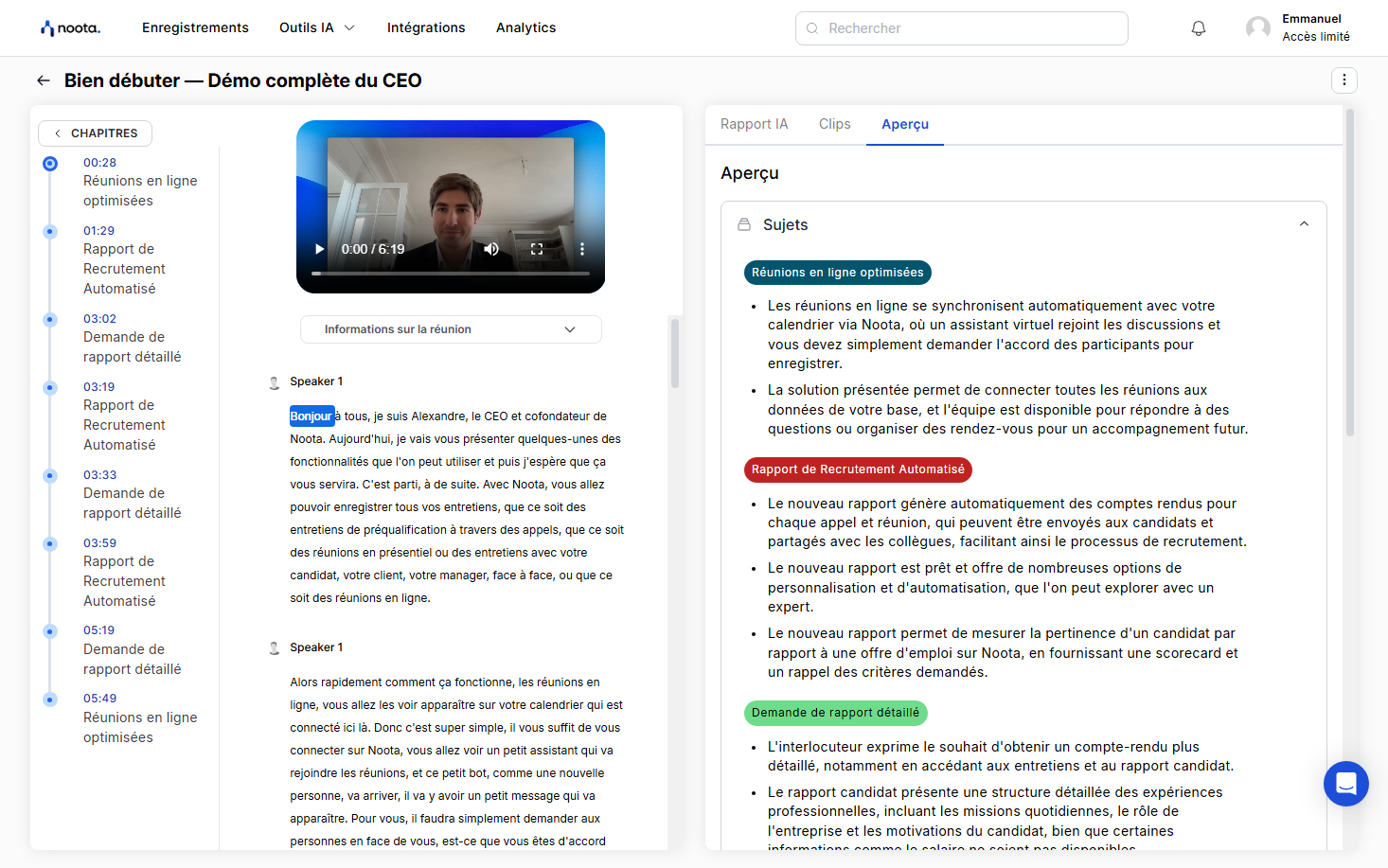 Noota transcrit et génère automatiquement la synthèse dans l’interface ; l’utilisateur la reçoit également par e-mail. Il est également possible de personnaliser le compte-rendu.