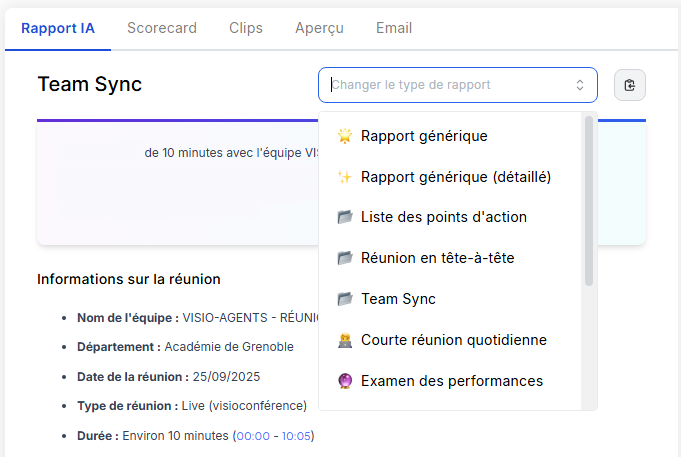 Depuis le sélecteur visible à droite de l’écran, on passe en un clic d’un rapport générique à un rapport plus détaillé, à une liste des points d’action, ou encore à des formats adaptés à la situation : tête-à-tête, réunion courte quotidienne, synchronisation d’équipe, etc.