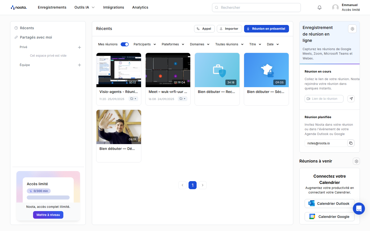 Démarrer l’enregistrement depuis Noota (ou importer un fichier audio/vidéo) ; obtenir transcription + synthèse puis ajuster/partager. - Appel audio.