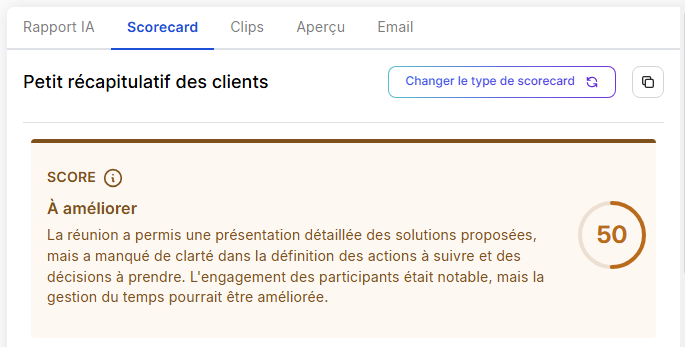 L’onglet Scorecard propose des indicateurs de lecture de la séance : répartition des temps de parole entre participants, dynamique des échanges, qualité perçue du déroulé (appréciation globale) ainsi que des éléments quantitatifs (nombre d’interventions, de questions, etc.).