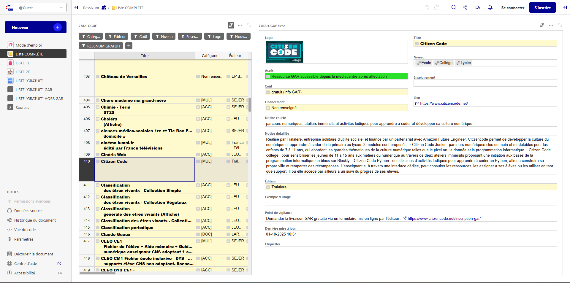 - À droite, la fiche détaillée de la ressource sélectionnée.