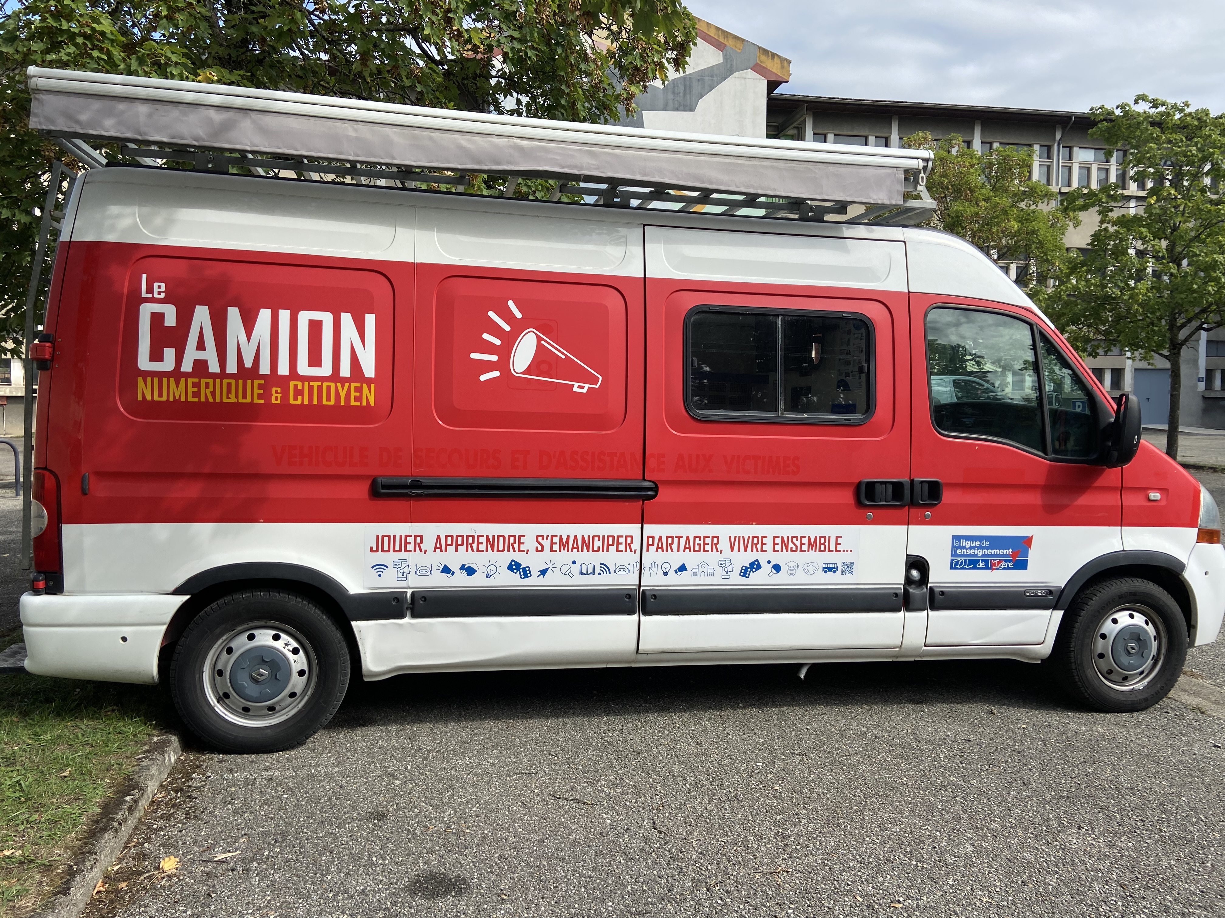 Parmi les outils phares déployés : le camion numérique et citoyen de la Ligue de l’enseignement de l’Isère. Véritable bibliothèque mobile, il se déplace sur les places de villages, à la sortie des écoles ou lors d’événements, avec à son bord :