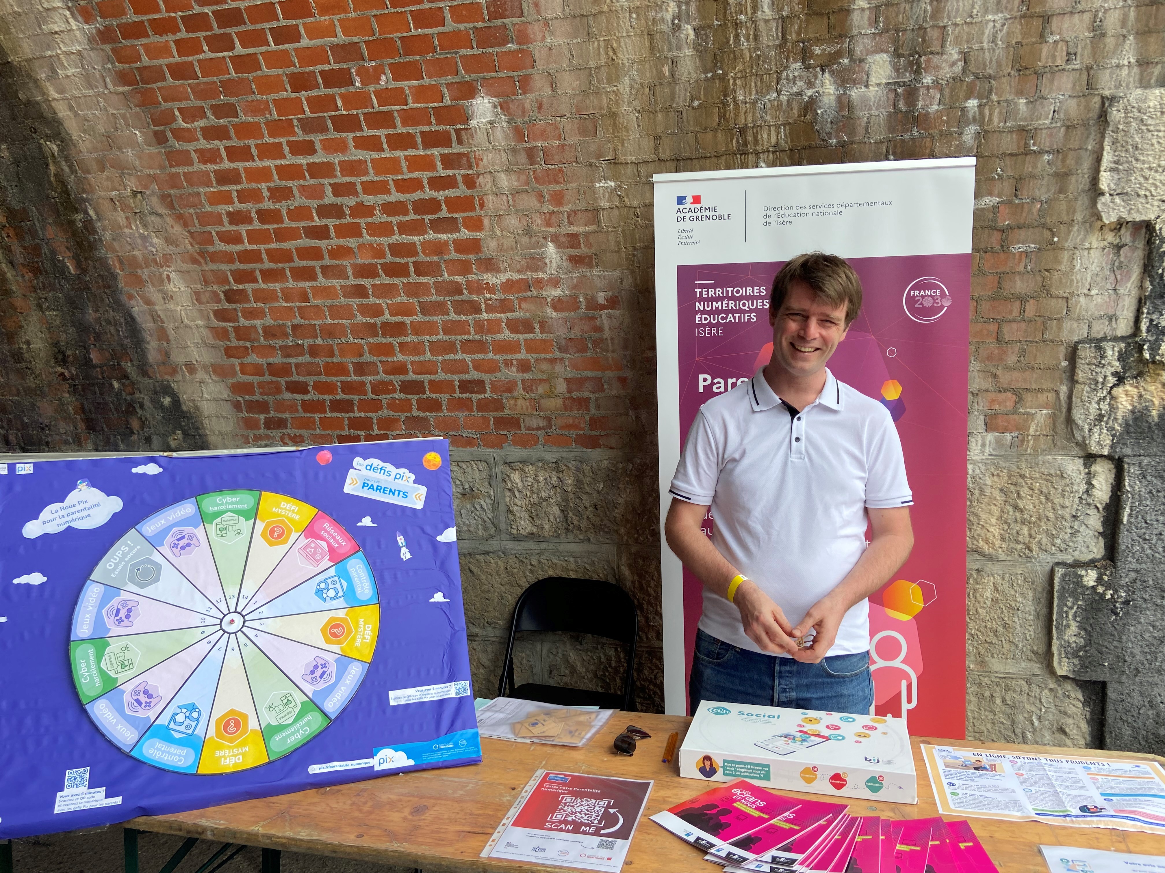 Stand de prévention animé par Joackim Wurtz avec la roue Pix comme outil d’échange. Discussions ouvertes sur l’usage des écrans, dont une situation de parent en grande difficulté a pu être prise en compte.